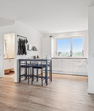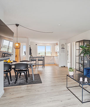 Med denne indretning er der både udsigt til de smukke omgivelser, når du tilbereder mad, underholder gæster – eller bare slapper af i sofaen. Indretningen er yderst funktionel men samtidig er hensynet til udsigten og hjertet i boligen tænkt ind på fineste vis.