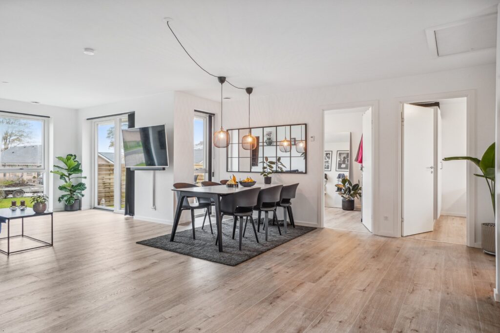 Til hvert hus hører både for- og baghave og indvendigt er Køkken-alrum og stue i direkte forbindelse med terrasse.