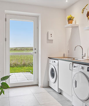 Husene er disponeret med bryggers, master bedroom, ét eller to værelser, og et stort køkken-alrum med et tidløst HTH køkken med Siemens hårde hvidevarer samt smukke og meget slidstærke laminatgulve med god akustik. Bryggers er praktisk indrettet med stor bordplade, vask og skabe.